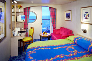 Описание кают: ВО ВСЕХ КАЮТАХ: телефон, телевизор, холодильник, сейф, одеяло, ванная с душем и феном. Большинство односпальных кроватей трансформируются в кровать размера queen-size. Приведенные размеры кают включают балконы, где они имеются.